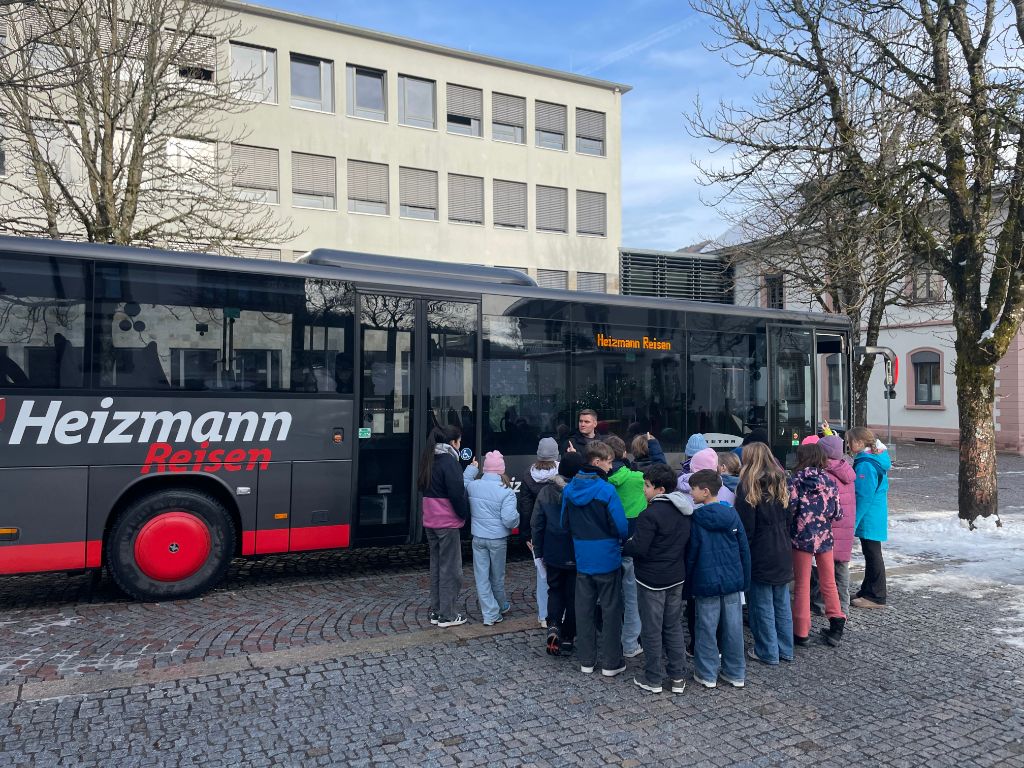 Am Mittwoch, den 14.01.2026, erhielten die Schülerinnen und Schüler der 5. Klasse eine umfassende und spannende Busschulung. Die Veranstaltung fand in zwei Teilen statt. Zum einen gab es eine theoretische Einheit mit der Präventionsstelle für Verkehrssicherheit der Polizei Lörrach, in der wichtige Verkehrsregeln, sichere Umgangsformen an Bushaltestellen und das richtige Verhalten rund um den Bus thematisiert wurden.