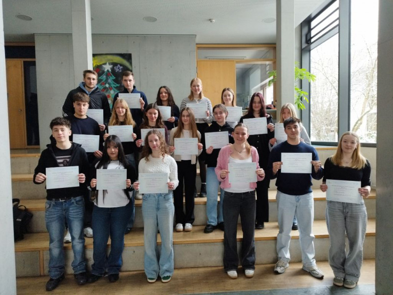 Stolz und verdient haben Schülerinnen und Schüler der Jahrgangsstufe 1 ihr Sprachzertifikat mit dem Niveau B1 entgegengenommen, das sie ihm Rahmen des Delf scolaire intégré Ende der 10. Klasse erworben haben. Das DELF (Diplôme d'Études en Langue Française) ist ein international anerkanntes Sprachzertifikat, das französische Sprachkenntnisse auf verschiedenen Niveaus bescheinigt. Im Rahmen des DELF scolaire intégré wird die Prüfung und deren Vorbereitung in den Unterricht integriert und von den speziell hierfür weitergebildeten Lehrkräften abgenommen. Das Zertifikat ist der Lohn für die kontinuierliche Arbeit, das Durchhaltevermögen und Engagement im Französischunterricht der letzten Jahre. Félicitations!