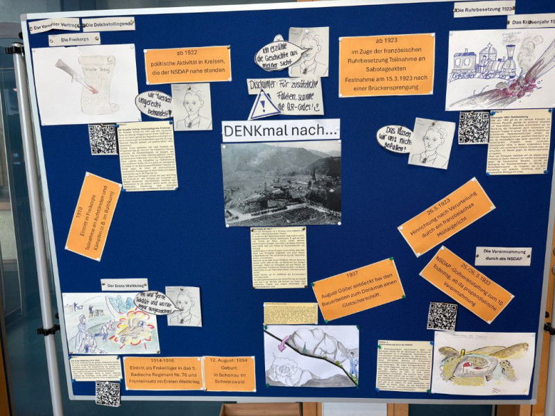Mit viel Mühe und Teamwork hat die Gruppe es geschafft, eine zugängliche und attraktive, aber auch historisch belegte Infotafel zu gestalten. Durch den Austausch mit dem Lörracher Kreisarchivar Herr Ute, dem Historiker Herr Noe und der Sichtung von historischen Quellen im Stadtarchiv, gelang es der Gruppe, inhaltliche Vollständigkeit zu garantieren. Doch die Infotafel besteht aus weit mehr als Informationen: Durch comicähnliche Elemente, die von der Gruppe selbst gezeichnet wurden, ermöglicht die kreative Infotafel einen multiperspektivischen Zugang zu dem komplexen Thema. Nachdem dieses Konzept dem Gemeinderat in der Sitzung am 17.11.2025 vorgestellt wurde, durfte sich die Gruppe über großes Lob freuen.
