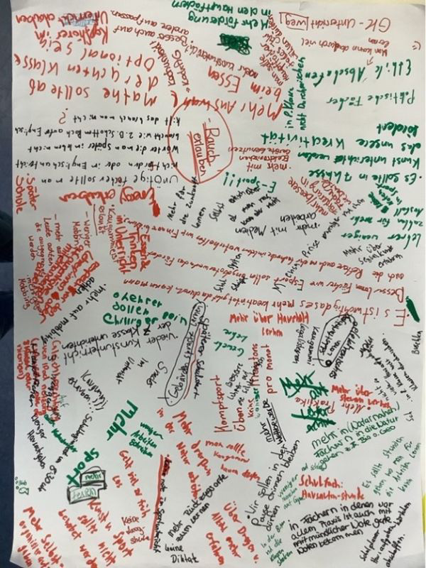 Doch sie konnten nicht nur ihre eigenen Meinungen zu den verschiedenen Themen darlegen, sondern auch mit verschiedenen Mitschüler*innen der eigenen Schule sowie der Nachbarschule diskutieren. Jede Stimme war dabei gleichermaßen wichtig und auch wilde Ideen absolut erlaubt – gar gewünscht.